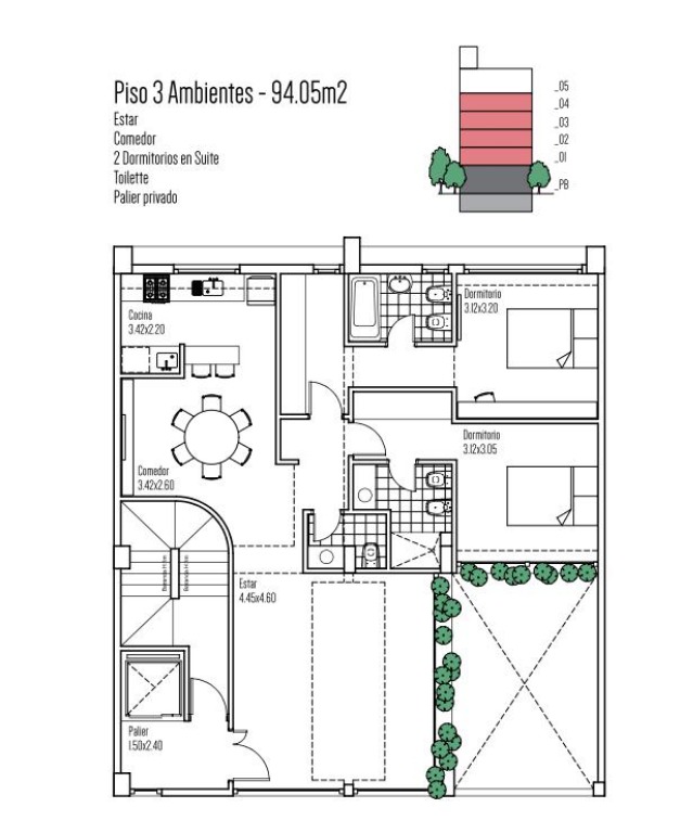 Dispone además de patio propio, ideal para disfrutar del aire libre en total privacidad, y cochera descubierta exclusiva, un valor que aporta comodidad y seguridad.