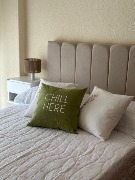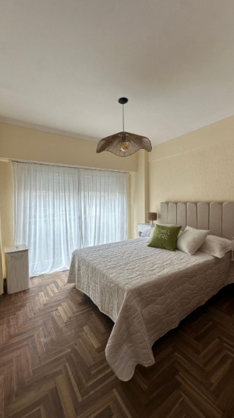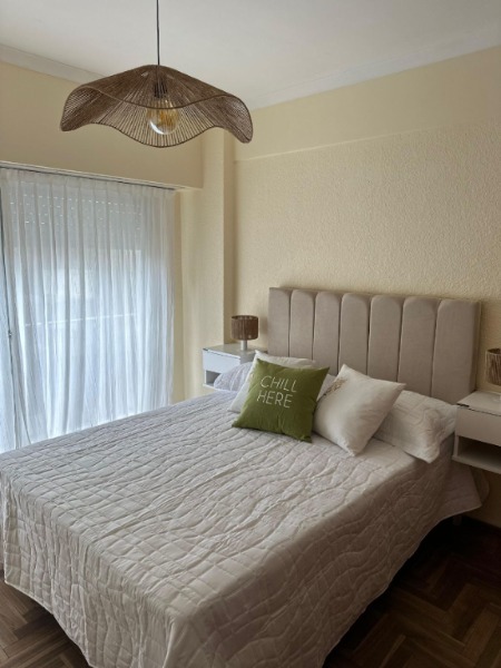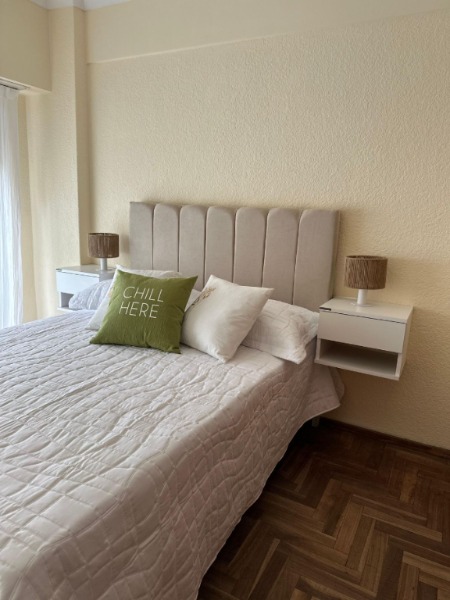 El dormitorio también se ubica al frente, con salida al balcón, placard empotrado y cama de dos plazas con respaldo.