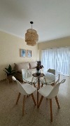 La unidad se dispone al frente y cuenta con un amplio living-comedor con salida a balcón corrido, lo que garantiza gran luminosidad durante todo el día. Desde el balcón se aprecia una vista lateral al mar. El espacio se encuentra equipado con mesa y cuatro sillas, sillón y TV de 43”.