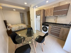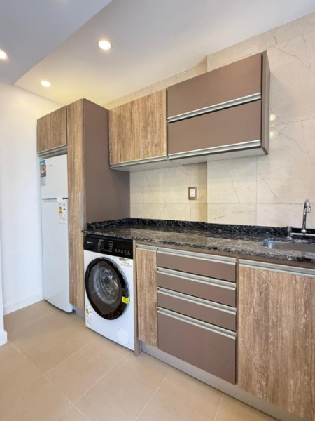 Cuenta con un ambiente cómodo y luminoso, con salida a un balcón saliente que aporta aire y luz natural. La cocina se integra de manera práctica y moderna, equipada con mobiliario renovado y electrodomésticos en perfecto estado. El baño fue reciclado a nuevo, con materiales actuales y una disposición funcional.