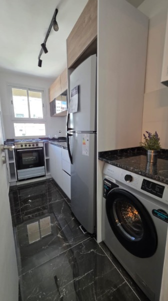 Cocina equipada con lavarropas automático, cocina de acero inoxidable y heladera con freezer.