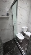 Baño principal reciclado, con mampara corrediza de vidrio templado.