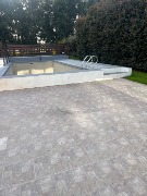 Piscina con deck tipo solárium, rodeada de un amplio espacio verde.