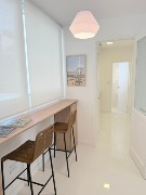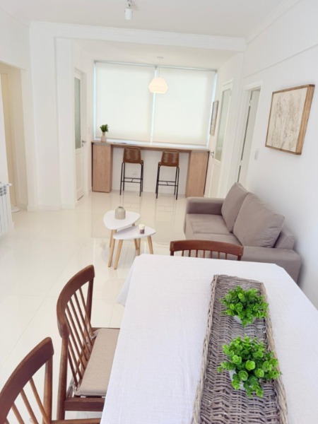 La propiedad cuenta con aproximadamente 70 m² totales. Presenta un amplio living comedor con salida al balcón y barra desayunadora con mueble de apoyo, generando un espacio moderno, funcional y muy luminoso.