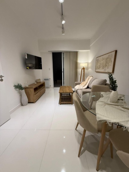 Al ingresar mediante hall de distribución, accedemos al amplio y cómodo living comedor con balcón salida a patio. TV de 43”. Sillón, mesa ratona, mueble para TV, mesa con 4 sillas, lámpara de pie, mueble de apoyo, cortinas Hunter Douglas. En el patio muebles de exterior