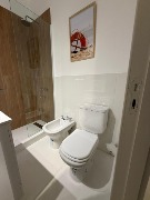 Un baño completo reciclado a nuevo con mampara, extractor de aire y espejo led