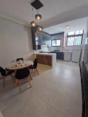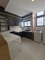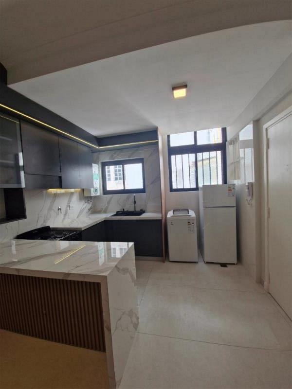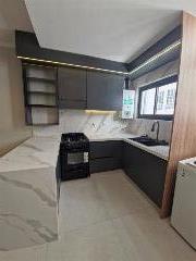 La cocina es separada, totalmente equipada con mobiliario a medida en melamina símil madera, mesadas de granito y ventilación natural.