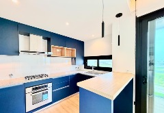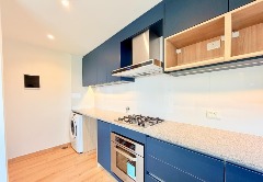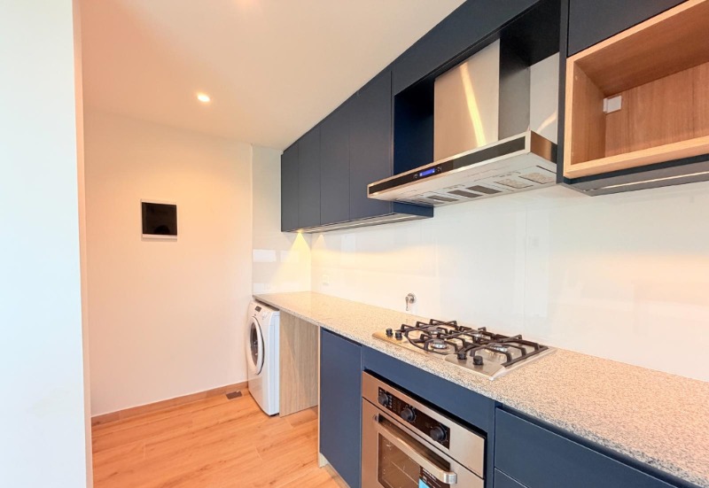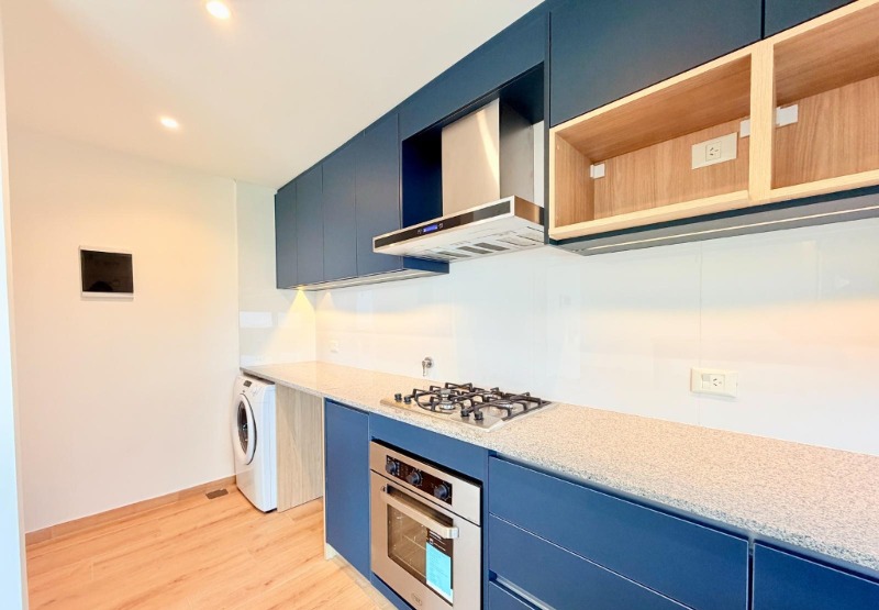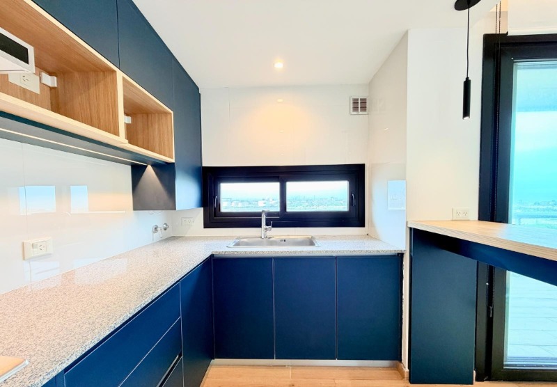 Cocina semi integrada, totalmente equipada, con barra desayunadora y espacio para lavarropas.